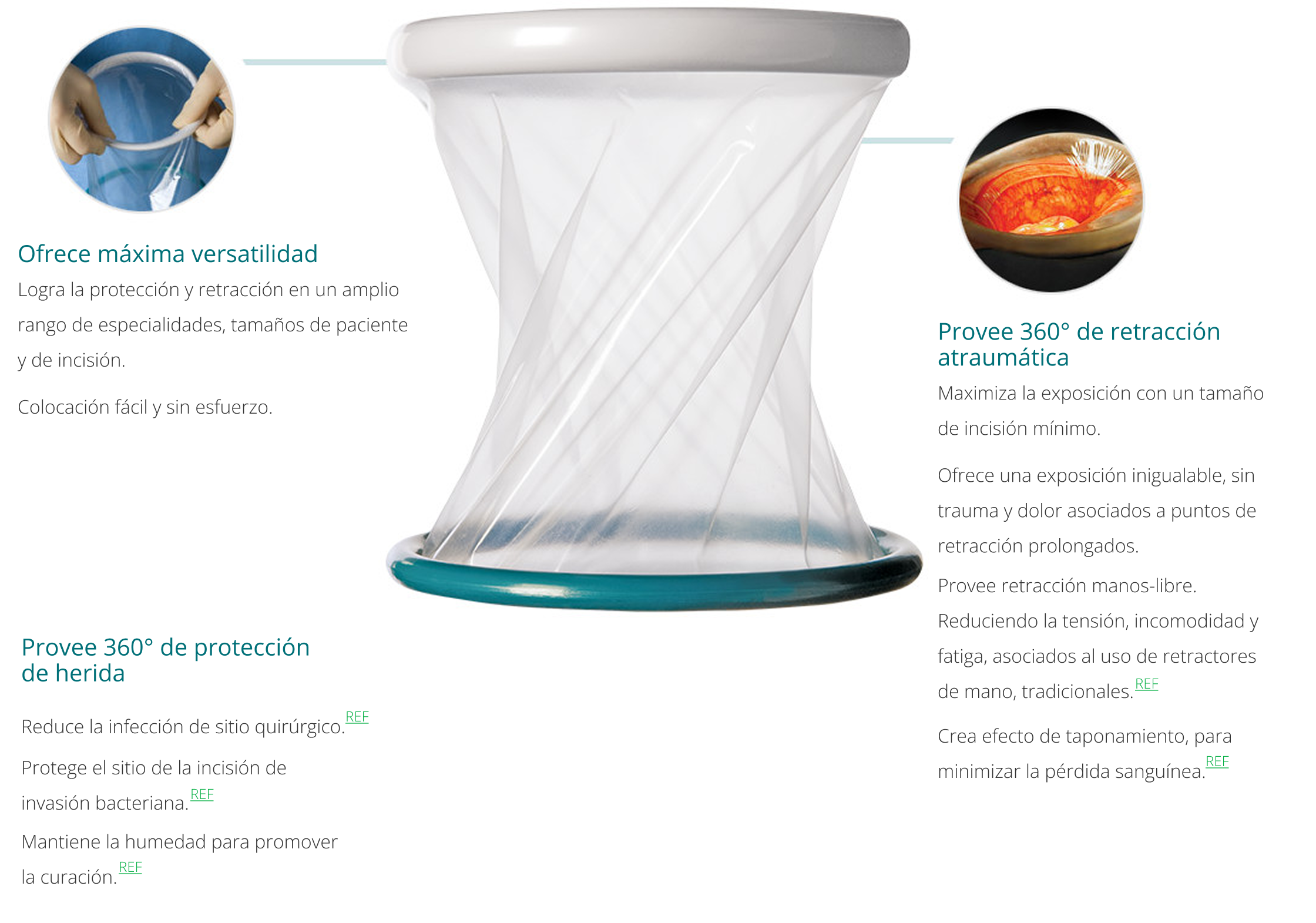 El Alexis protector/retractor de herida, provee 360º de retracción circunferencial y atraumática. El Alexis protector/retractor de herida mantiene húmedo el sitio de incisión y potencialmente reduce las infecciones superficiales de sitio quirúrgico derivadas de cirugías colorectales. REF